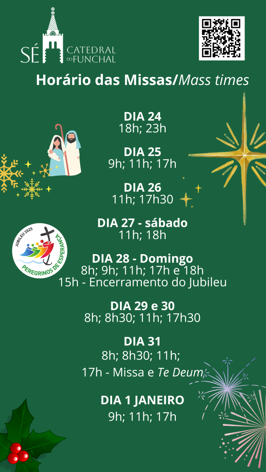 Dia 25 de dezembro e 1 de janeiro: 9h; 11h; 17h